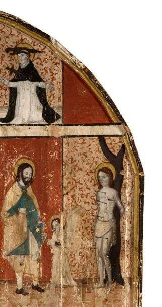FRAGMENT DE RETABLE en bois peint représentant sur deux registres saint Pierre de Vérone, saint Roch ? et saint Sébastien.Italie, XVe siècle