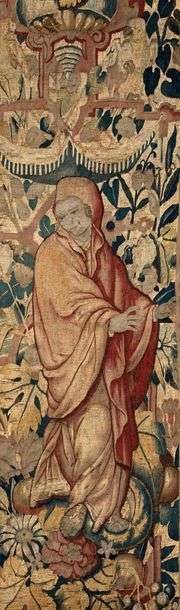 FRAGMENT de bordure latérale d'une tapisserie à décor d'une figure féminin