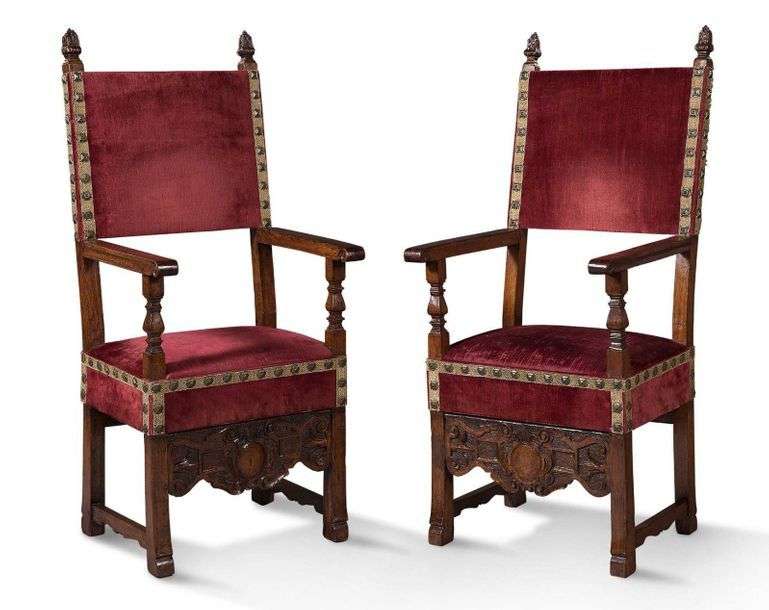 PAIRE DE FAUTEUILS en noyer à haut dossier, piètement avec bandeau en façade à décor d'un cartouche et de volutes, accotoirs droits supportés par des balustres.Espagne, XVIIe siècle