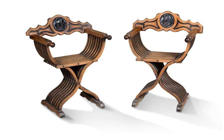 PAIRE DE CHAISES de forme curule pliantes en bois naturel mouluré. Le dossier est orné d'un bandeau au centre duquel se trouve un médaillon à profil d'homme casqué. Travail dans le goût de la Renaissance italienne