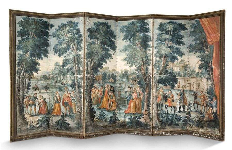 PARAVENT formé de six panneaux en toile peinte orné d'un décor de scènes galantes dans un parc. Allemagne, XVIIIe siècle