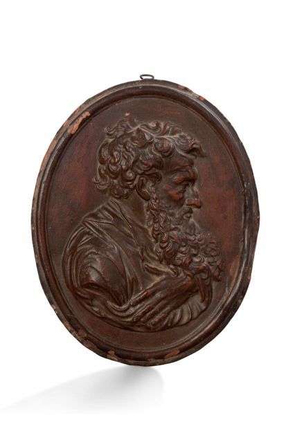 MÉDAILLON de forme ovale en terre cuite patinée représentant un philosophe