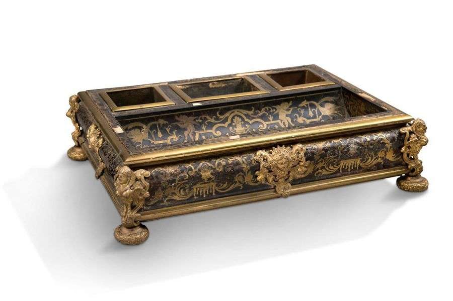 GRAND ENCRIER à trois godets de forme rectangulaire en marqueterie dite «Boulle» en première partie de laiton sur fond d'écaille et ornementation de bronze ciselé et doré. En partie centrale, un grand réceptacle à plume de forme incurvée est ornée d'un décor de puttis flûteurs assis sur une arcature, à leurs côtés, griffons, urne antique et rinceaux feuillagés. Les parties latérales également marquetés sont ornés de chutes de draperies et d'arabesques. Sur chaque côté, des masques féminins sont disposés en appliques, et sur chaque angle figure une sphinge ailée. Il repose sur quatre pieds en forme de boules aplaties.XVIIIe siècle