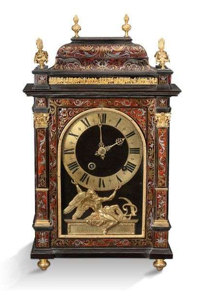 PENDULE RELIGIEUSE de forme rectangulaire en marqueterie Boulle en première partie de laiton, étain, sur fond d'écaille rouge et ornementation de bronze ciselés et dorés. La partie haute marquetée de rinceaux feuillagés, recèle le timbre. Elle est surmontée de six pots à feux et d'une balustrade ajourée. La caisse ornée d'une frise de rang perlé est flanquée de part et d'autre de colonnes à chapiteaux corinthiens. Le cadran annulaire en laiton indiquant les heures en chiffres romains, est monté sur une plaque de velours noir. Il est spporté par le dieu du temps, Chronos assis sur un cartouche signé «Nicolas GRIBELIN à Paris». Aiguilles repercées et gravées en bronze doré. La partie basse est terminée par quatre boules aplaties. Mouvement à fil et balancier d'époque. XVIIe siècle