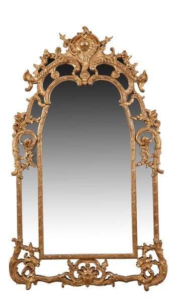 MIROIR À PARECLOSES en bois mouluré richement sculpté et doré à décor rocaille. Fronton orné d'un motif d'agrafe d'où s'échappent des rinceaux feuillagés.