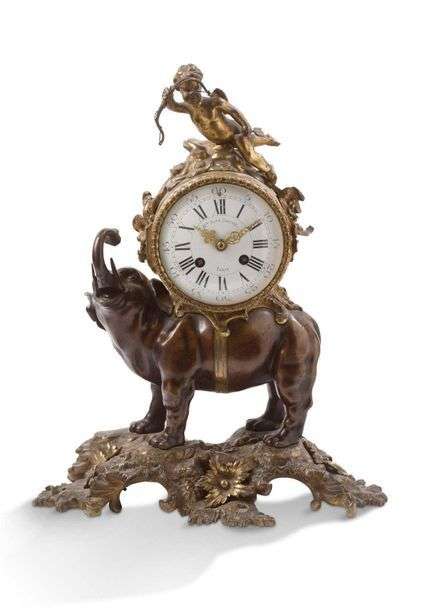 Pendule à l'éléphant en bronze ciselé patiné et anciennement doré reposant sur une terrasse feuillagée. Elle est surmontée d'un amour ailé.Le cadran émaillé présente les heures en chiffres romains et les minutes en chiffres arables. Signé Mon Alph. Giroux à Paris. Vers 1880, style Louis XV
