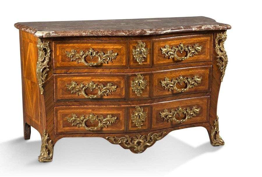 COMMODE DITE TOMBEAU de forme galbée en placage en frisage de bois de rose, dans des encadrements en amarante. Les panneaux latéraux reçoivent un décor losangé. Elle ouvre en façade par cinq tiroirs sur trois rangs avec traverses et repose sur quatre pieds légèrement cambrés. Riche ornementation de bronzes ciselés et dorés telle que : entrée de serrure, poignées de tirage, tablier feuillagé. Plateau de marbre violet veiné gris et blanc mouluré en tore Epoque Louis XV Estampillée MONDON et JME sous le plateau à deux reprises