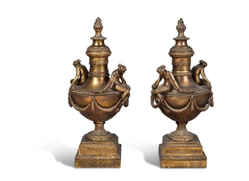 PAIRE D'URNES FLAMMÉES en bronze à figure de femmes assises sur la panse.