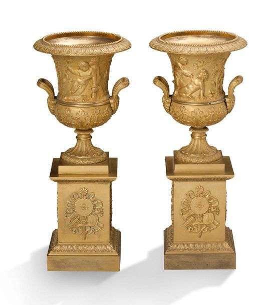 Paire de vases de forme Médicis en bronze ciselé doré ornés d'une frise d'enfants Bacchus et de rinceaux de pampres de vignes et d'une frise de feuilles d'acanthe. Ils reposent sur une base quadrangulaire à décor en applique de motifs aux instruments de musique. Première moitié du XIXe siècle