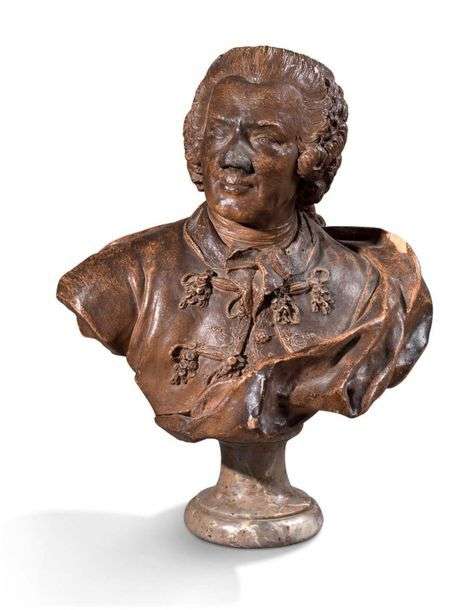BUSTE DE GENTILHOMME en terre cuite patinée sur piédouche en marbre XVIIIe