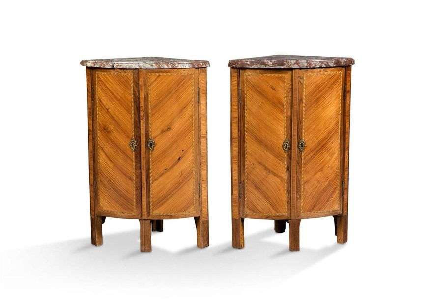 PAIRE DE PETITES ENCOIGNURES en placage de satiné ouvrant par deux portes. Plateaux de marbre rouge (cassés) Fin de l'époque Louis XVI