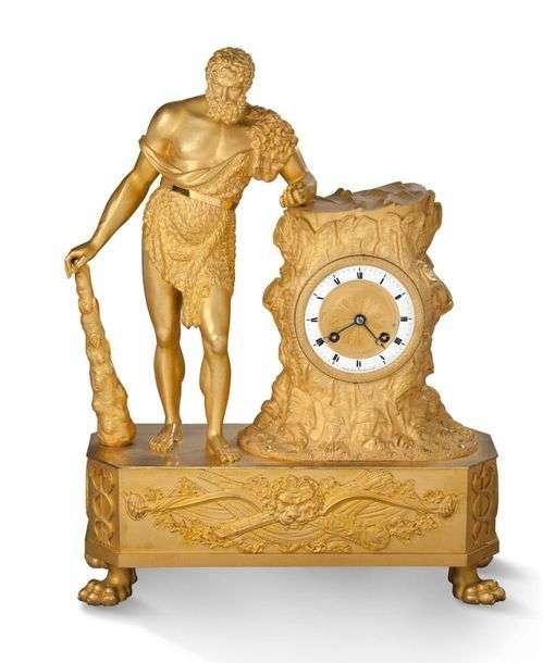 PENDULE en bronze ciselé doré représentant Hercule adossé à un tertre. Le
