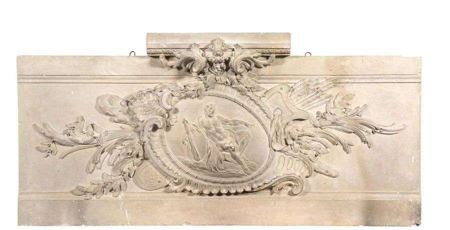 Moulage en plâtre grandeur nature du fronton en marbre et bronze doré surmontant la cheminée du salon d'Hercule à Versailles. Il est orné d'un métaillon figurant Hercule assis de côté appuyé sur sa massure et la peau de Nemée. En arrière plan, est représenté un trophée d'armes et de feuillages.