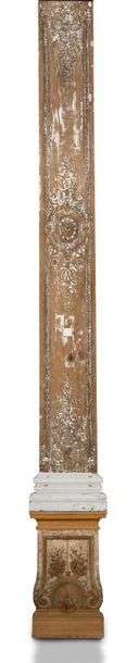 RÉUNION DE DEUX PILASTRES en chêne mouluré et sculpté composé d'un soubassement orné d'une large coquille enserrée dans deux cornes d'abondance débordant de fleurs, et de feuilles d'acanthe. La partie centrale est à motif d'un fleuron dans un entourage godronné et d'un masque féminin. La partie supérieure est ornée d'une coquille et d'entrelacs feuillagés. Entablement à décor de frises de fleurettes. Chapiteau corinthien. L'un a été anciennement rechampi.