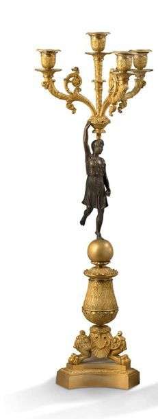 PAIRE DE GRANDS CANDÉLABRES AUX VICTOIRES en bronze ciselé, doré et patiné à quatre bras de lumières de forme torsadée. Le fût est orné d'une jeune femme à l'antique, allégorie des Victoires, se tenant debout en équilibre, un pied reposant sur une sphère. Le socle est à décor ciselé de fleurettes dans un motif d'écailles, Il repose sur un piètement tripode composé de trois pattes de lions et palmettes. Contre-socle orné d'une frise de feuilles d'eau. Epoque Restauration
