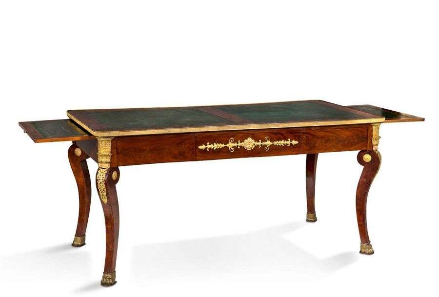 BUREAU PLAT en placage d'acajou moiré.Il ouvre en ceinture par trois tiroirs et deux tirettes latérales. Il repose sur quatre pieds en console terminé par des pieds griffes en bois doré. Belle ornementation de bronzes ciselés dorés à motifs de cygnes, chapiteaux simulés rosaces, feuillages, grattoirs tel que : entrées de serrure, poignées de tirage, montants. Le plateau rectangulaire ceint d'une lingotière de laiton est gainé de cuir vert. Époque Empire