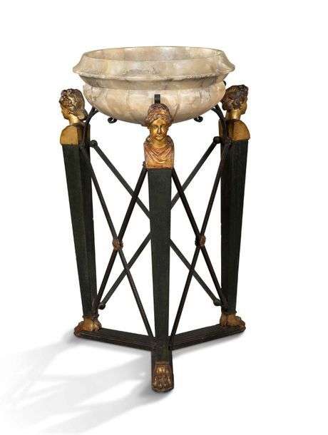 GRANDE VASQUE en albâtre sculpté reposant sur un piétement tripode en fer forgé. Chacun des pieds de forme quadrangulaire est surmonté d'un profil masculin et féminin en bois sculpté doré, disposés en alternance. Ils sont reliés entre eux par des croisillons réunis par des fleurons et terminés par des pattes de lion. Epoque Empire.