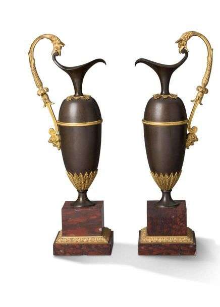 Rare paire d'aiguières aux griffons de forme stylisée en bronze patiné et finement ciselé doré reposant sur un piédouche. Le corps de l'aiguière, de forme balustre et légèrement fuselé est orné en son centre, d'un cerclage en bronze doré, d'une frise de palmettes appliquée à l'épaulement et à la base, d'une frise de feuille d'acanthes. Les anses à tête de griffons sont ornées à mi-hauteur d'une fleurette et de feuilles d'acanthe. Socle de marbre rouge griotte Vers 1800
