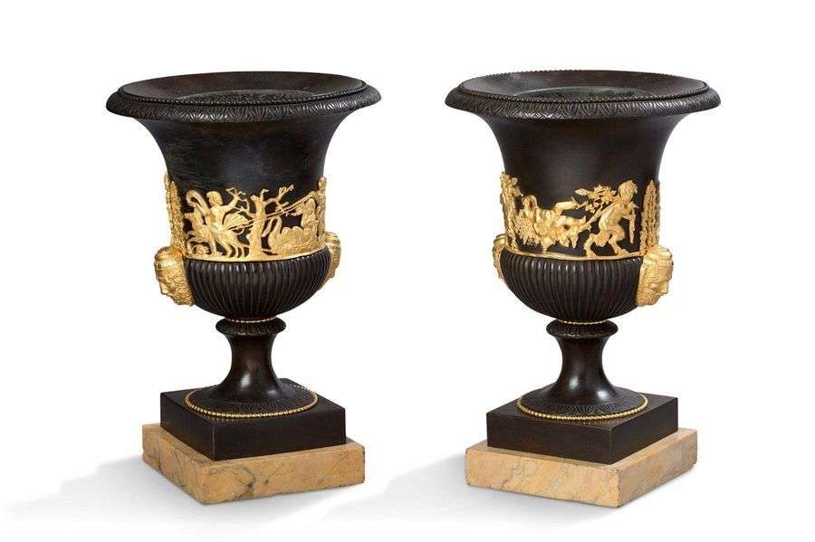 PAIRE DE VASES MEDICIS en tôle laquée noire. Ornementation de bronze ciselé et doré en frise représentant sur une face deux faunes portant Bacchus enfant alangui sur un lit de pampres, et sur l'autre, trois putti dans un cortège au char. La panse godronnée est ornée de masques d'hommes barbus. Le col et la base sont soulignés de frises de feuilles d'eau et de rang perlés. Contre-socle en marbre jaune de Sienne. Epoque Empire