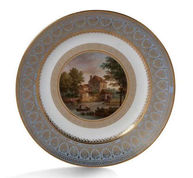 Trois assiettes en porcelaine représentant les PETITES VUES DE FRANCE commandées par le Roi Louis-Philippe pour le château des Tuileries à partir de 1832: Les bords de la Scarpe, Saint-Guilhem-le-désert, Coulommiers.