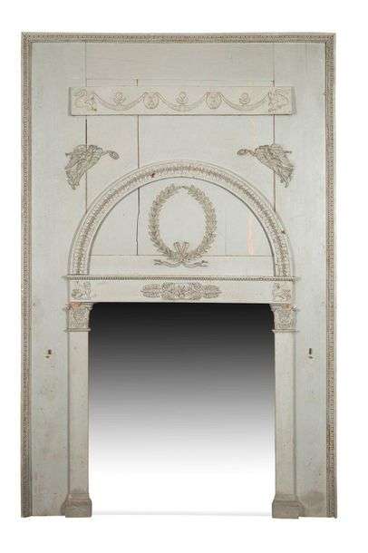 GRAND TRUMEAU en bois mouluré sculpté et laqué gris orné de guirlandes et de renommées Epoque Empire