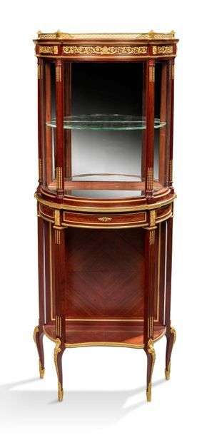 Vitrine de forme demi-lune en placage d'acajou marqueté en quartefeuille et riche ornementation de bronzes ciselés dorés. La partie supérieure ouvre en façade par une porte vitrée. La ceinture ouvre par un tiroir et la partie inférieure présente une petite tablette. Montants arrondis et aplatis ornés de cannelures à asperges. Elle repose sur quatre pieds cambrés. Lingotière en bronze doré ajouré. Signée P. SORMANI Paris, 10 rue Charlot sur la serrure. Fin du XIXe siècle