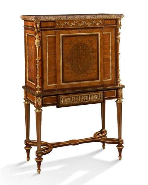 Henry DASSON (1825-1896) fut l'un des plus célèbres ébénistes et bronziers de la seconde moitié du XIXe siècle. Avec d'autres ébénistes, il fait revivre le mobilier du règne de Louis XVI que l'impératrice Eugénie aimait tant. L'élégance du piètement de ce secrétaire rappelle par exemple la célèbre table à écrire conçu par Adam WEISWEILER (1746-1820) pour Marie-Antoinette et livrée en 1784 au château de Saint-Cloud par le marchand mercier DAGUERRE, aujourd'hui conservée au Musée du Louvre.