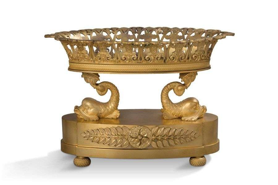 SURTOUT DE TABLE À CORBEILLE AJOURÉE en bronze ciselé doré soutenu par deux dauphins. Ils reposent sur une base oblongue à décor appliqué d'une rosace et branchages. La base repose sur quatre pieds boulle. Attribué à Pierre-Philippe Thomire Première moitié du XIXe siècle