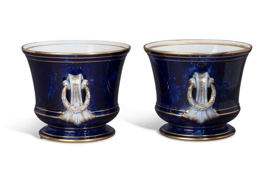 Paire de vases dits «caches-pots Griffaut garni» en porcelaine de Sèvres en forme de sceaux. Fond bleu lapis marbré et filets dorés sur le col et la base. Les anses en forme de rinceaux d'acanthe et de guirlandes de lauriers sont en bleu lavande rehaussé d'or. Marqués S. 73 en vert et RF à Sèvres 75 en rouge carmin. Fin du XIXe siècle, vers 1873/1875