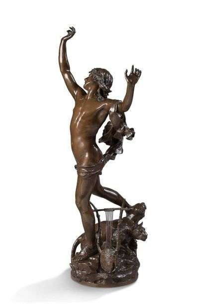 Epreuve en bronze à patine brune figurant Oprhée debout, les bras levés en légère contorsion, sur une terrasse rocheuse,il enjambe Cerbère et son luth. Signé Raoul Verlet sur la terrasse Fonte BARBEDIENNE