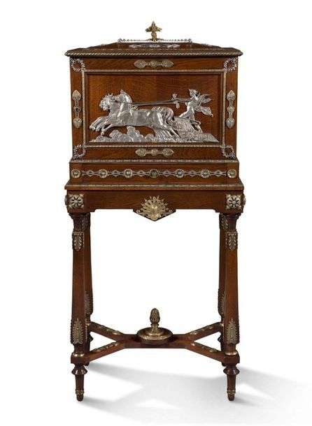 Cabinet formant cave à cigares en chêne naturel, ornementation de bronze ciselé et argenté. La partie haute est ornée d'un décor d'Apollon sur son char tiré par un quadrige. Il ouvre en façade à une porte découvrant cinq tiroirs plats à fond de canne. La caisse repose sur quatre pieds tronconiques réunis par une entretoise. Motifs de palmettes stylisées, fleurettes, couronnes de lauriers, frises d'oves et pomme de pins. Epoque Napoléon III