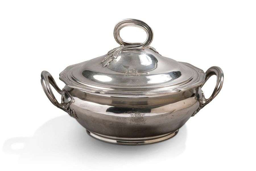 LÉGUMIER COUVERT en argent uni à décor armorié. Panse et couvercle de forme mouvementée, pourtour chantourné. Anses et frétel en appliques terminées par des feuillages Poinçon Minerve