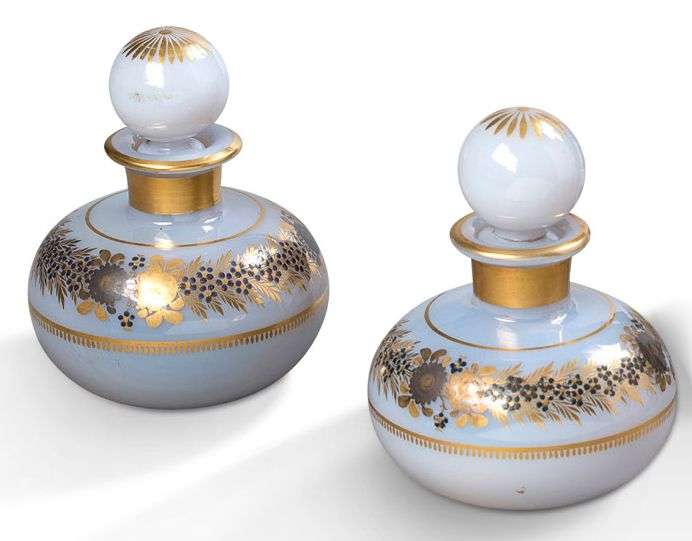 PAIRE DE FLACONS COUVERTS de forme boule en opaline de cristal savonneuse