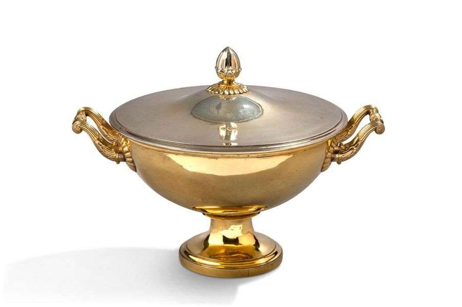 SOUPIÈRE EN VERMEIL reposant sur un piedouche circulaire. Le frétel en forme de pomme de pin. Deux anses à volutes. Poinçon illisibles