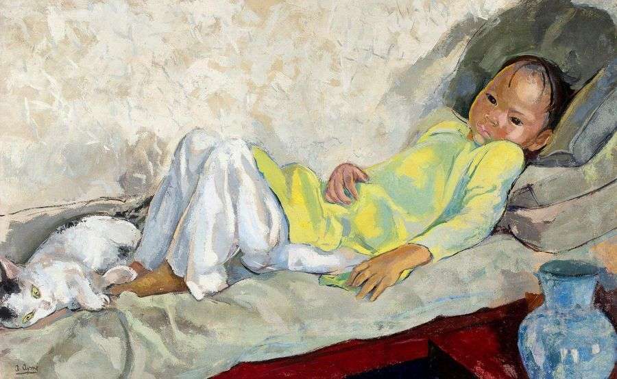 The child lying here is reminiscent of the painting described above. The atmosphere here is very different. The represented child, still in half-sleep, is lying motionless, with an empty gaze. The minimal decoration and the bright light reinforce the feeling of torpor that reigns. An oppressive and sweaty heat seems to crush the young child and his cat. The water jug, on the side, and the red floor create a strong contrast with the whiteness of the wall and thus highlight the intensity of the play of light that the artist skillfully plays with.