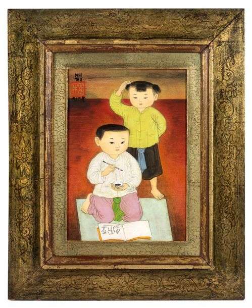 L’œuvre ci-contre, pleine de douceur et de naïveté, représente deux enfants. L’un est assis par terre en train de dessiner au pinceau et à l’encre, l’autre le regardant songeur. L’enfant agenouillé esquisse un regard au spectateur. Les traits fins employés, ainsi que les vives et chaleureuses couleurs utilisées par le peintre soulignent les formes ainsi que les expressions des personnages.