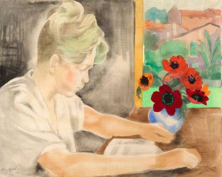 Tác phẩm này vẽ một cậu bé đang đọc. Cậu ta có vẻ tập trung. Các tông màu được sử dụng là màu pastel và màu tối, ngoài bó hoa ở bên trái của nhân vật được tạo thành từ các màu rất sáng và dày. Phong cảnh bên ngoài, cũng đầy màu sắc, được mời vào căn phòng tối này thông qua một cửa sổ ở cuối bàn. Alix Aymé hoàn toàn làm chủ kỹ thuật vẽ trên lụa.