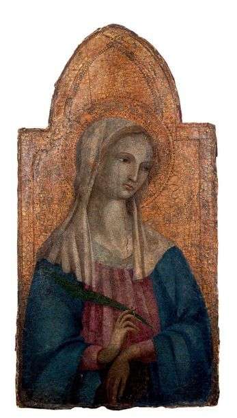 Sous la tutelle de Duccio, Lorenzetti et Simone Martini entre autres développent un style de retables qui, comme la Maestà, sont des trésors de l'art occidental. Ces retables sont composés, pour la plupart, de grands panneaux représentant la Vierge à l'enfant. Enchâssés dans des boiseries, des saints martyres et docteurs de l'Eglise encadrent cette figure fondamentale de la Chrétienté. Le petit panneau que nous présentons provient certainement d'une de ces grandes compositions réalisées dans la région de Sienne au début du XIVe siècle.