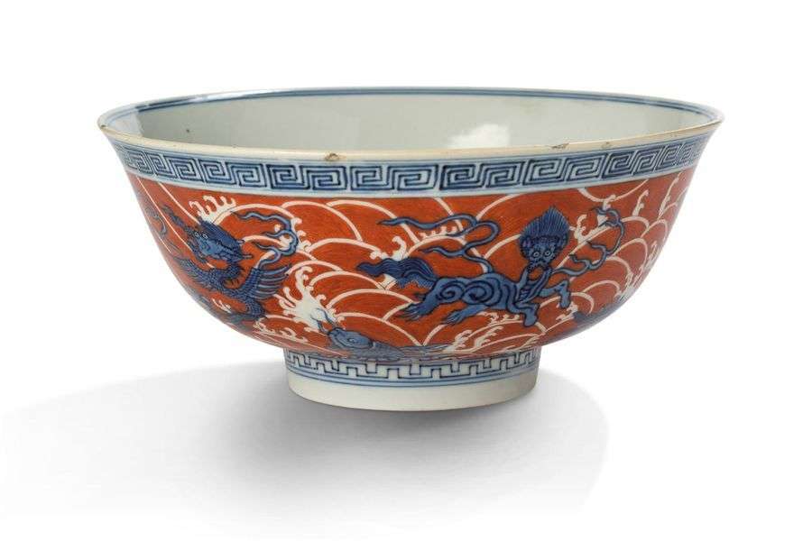 Grande coupe en porcelaine émaillée en bleu sous couverte, reposant sur un fond corail, à décor de dragons, lions bouddhiques, chevaux ailés, daims et carpes, parmi des vagues. Le bord et le pied ornés de frises de grecques. Marque Jiaqing en zhuanshu sur la base.