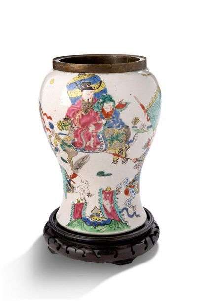 Vase balustre en porcelaine et émaux de style famille rose, à décor d'une scène équestre issue des Trois Royaumes, des chauves-souris survolant la scène. Le col cerclé de métal. Marque au double-cercle sur la base. Avec socle.