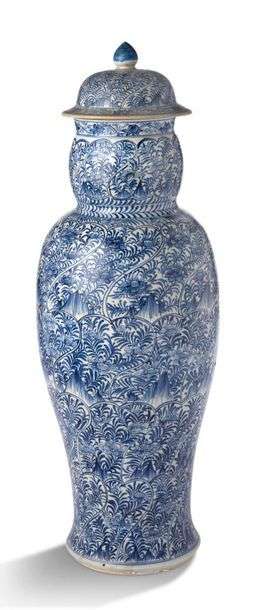 Grand vase balustre couvert, à col légèrement bulbeux, en porcelaine bleu-blanc entièrement décoré de fleurs et feuillages de pivoines stylisés. Marque à la feuille dans un double cercle sur la base.