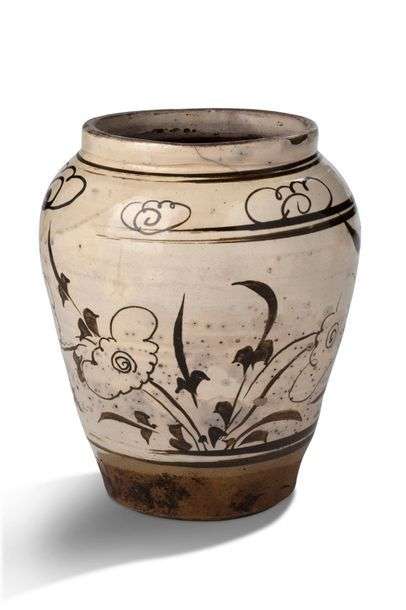Jarre en céramique à décor en brun sur fond beige, de fleurs d'orchidées et nuages stylisés.