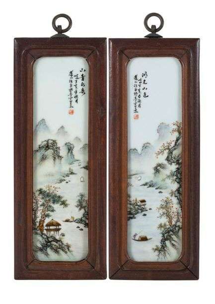 Paire de plaques en porcelaine et émaux de la famille rose, à décor de paysages lacustres animés d'embarcations et pavillons entouré de pics montagneux. Signé Wang Ye Ting.