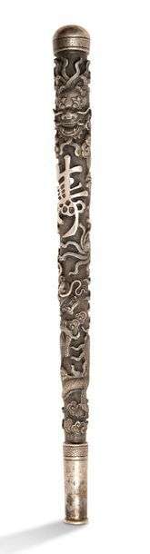 Manche d'ombrelle en bel argent à décor en relief de dragons et caractères shou (longévité).