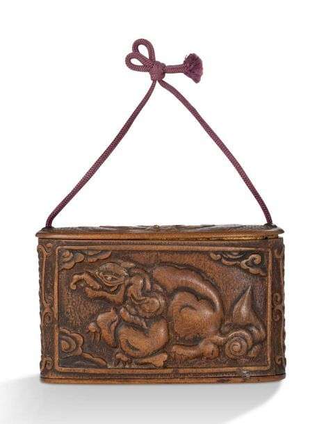 Tonkotsu en bois, à décor sculpté d'un Baku sur une face et d'une chauve-souris volant au-dessus de flots auprès d'un pin de longévité, le couvercle orné d'une chauve-souris dont les yeux sont incrustés de corne, l'intérieur anciennement laqué or. Avec marque apocryphe sur la base, donnant une date chinoise, 2e année du règne de Yongzheng (1724).