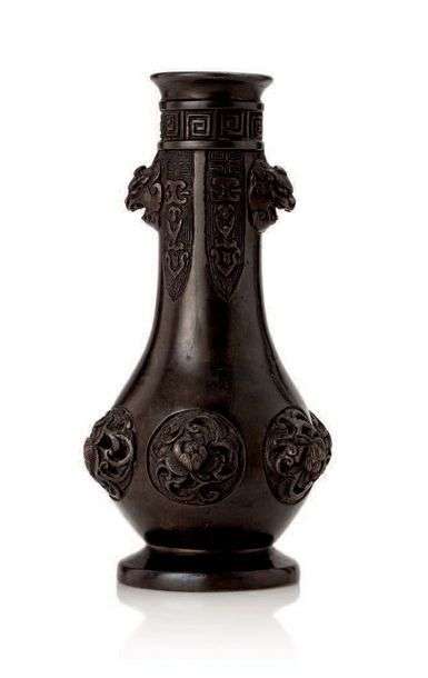 Petit vase à long col, pour le matériel à encens, en bronze de patine brune, la panse ornée de médaillons floraux en haut-relief, le col à décor de masques zoomorphes, cigales stylisées et frise de grecques.