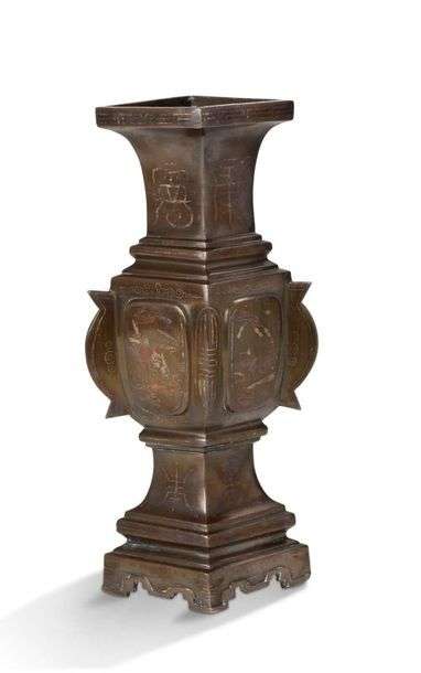 Garniture de trois pièces en bronze de patine brun-rouge comprenant un grand brûle-parfum quadrangulaire couvert avec socle, et une paire de vases gu de section losangique, à décor niellé d'argent et rehaussé de rouge de scènes animées de personnages, motifs floraux et stylisés, et caractères shou (longévité).