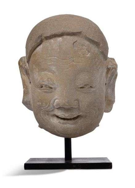 Tête en grès gris de Guangdong représentant un Luohan souriant, les lèvres légèrement entrouvertes. Sur son socle.