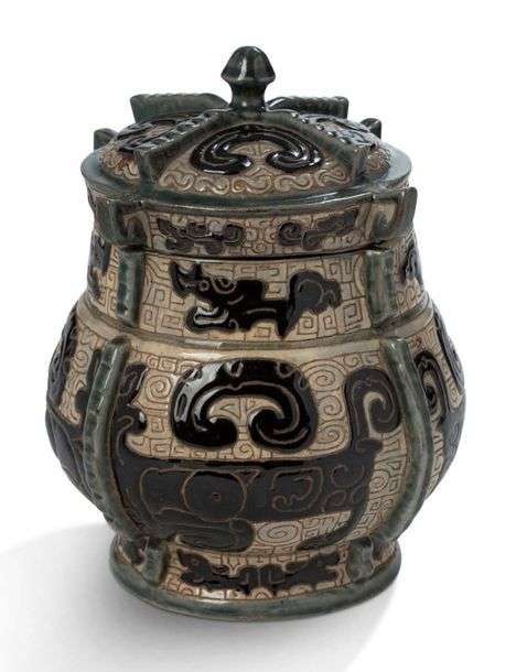 Pot couvert de Bien Hoa en grès émaillé polychrome, à l'imitation d'un bronze archaïque You, à décor en relief de dragons stylisés sur un fond beige orné de leiwen.