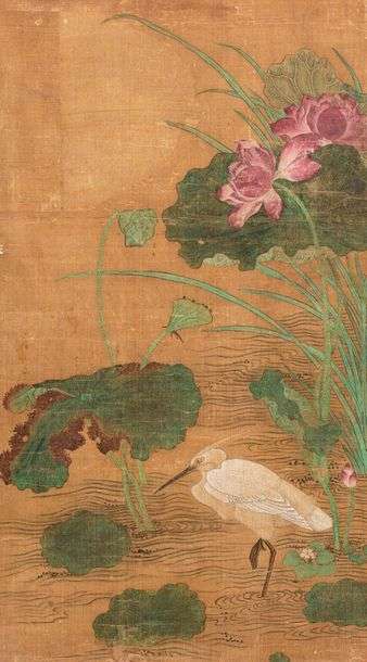 Grande peinture en couleurs sur soie, représentant un héron blanc debout dans l'eau, auprès de lotus en fleurs et de roseaux.